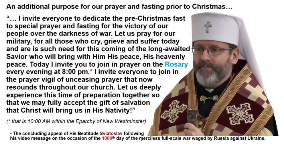 “… I invite everyone to dedicate the pre-Christmas fast to special prayer and fasting for the victory of our people over the darkness of war. Let us pray for our military, for all those who cry, grieve and suffer today and are is such need for this coming of the long-awaited Savior who will bring with Him His peace, His heavenly peace. Today I invite you to join in prayer on the Rosary every evening at 8:00 pm.* I invite everyone to join in the prayer vigil of unceasing prayer that now resounds throughout our church. Let us deeply experience this time of preparation together so that we may fully accept the gift of salvation that Christ will bring us in His Nativity!”