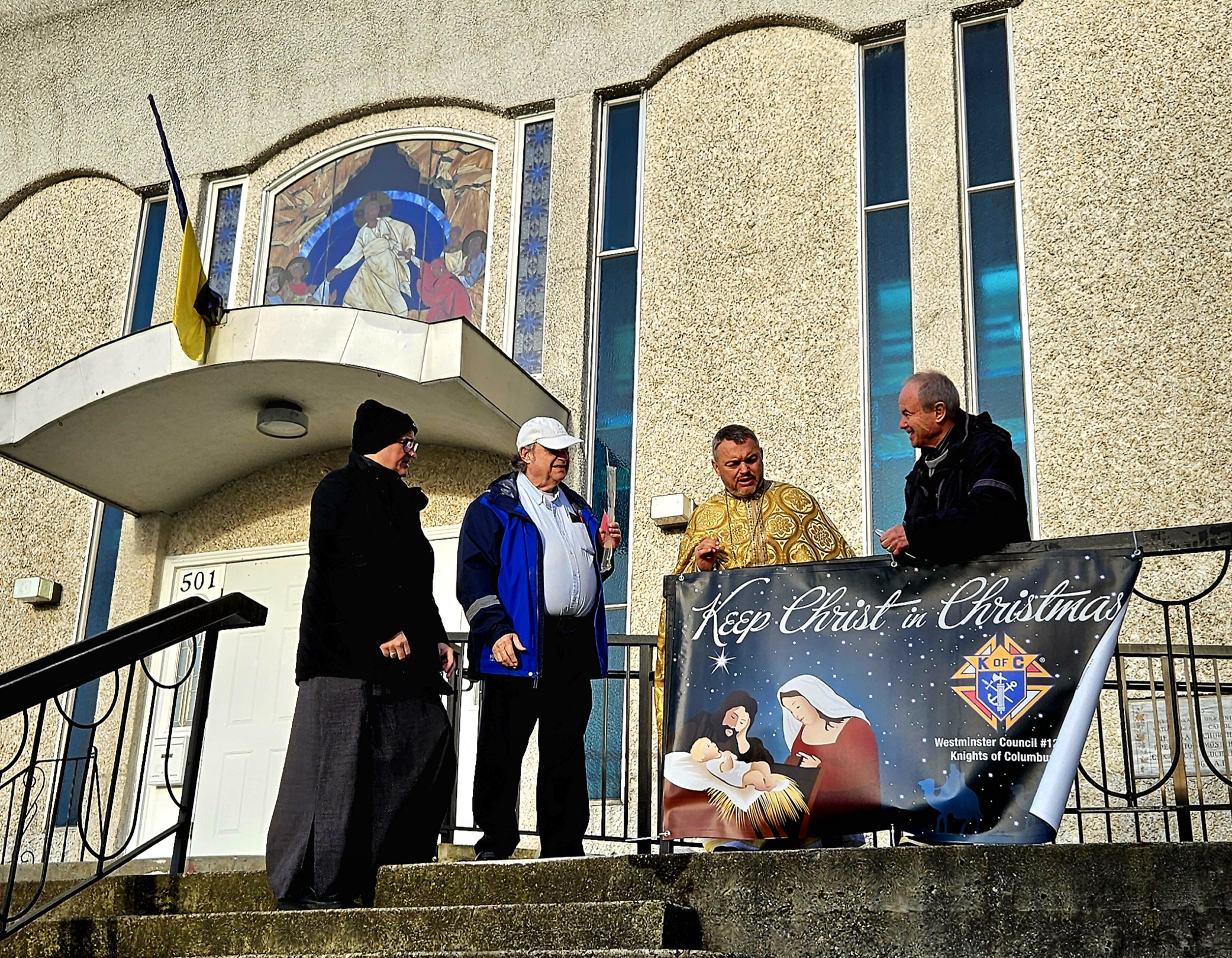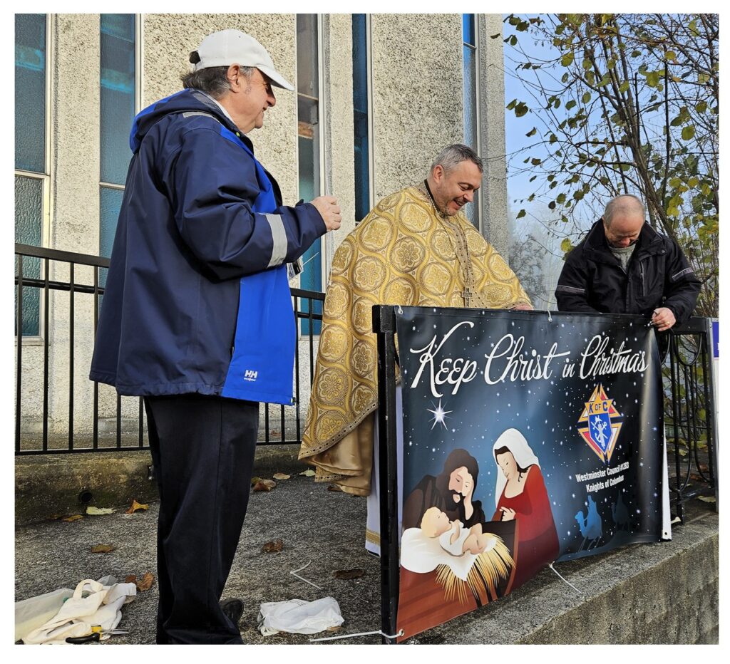 Knights of Columbus from the local New Westminster Council #1283* set up the “Keep Christ in Christmas” sign that is now a custom at most Catholic churches across North America. This sign was placed at the top railing of the front steps of Holy Eucharist Cathedral of the Eparchy of New Westminster.